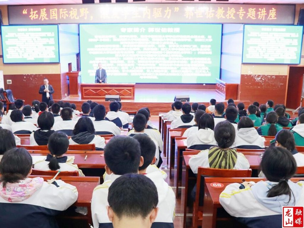 龙山县融媒体中心4月24日讯(通讯员 彭吉山 张贤超 向富勇) 4月22日下午,皇仓中学报告厅内座无虚席,著名历史学者、跨学科博士生导师郭世佑教授以“拓展国际视野,激发学生内驱力”为主题开展专题讲座。皇仓中学、华鑫学校高一、高二年级学生代表现场沉浸式聆听学习。