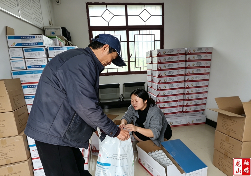 贾丽(右一)为村民发放柑橘病虫害防控药剂