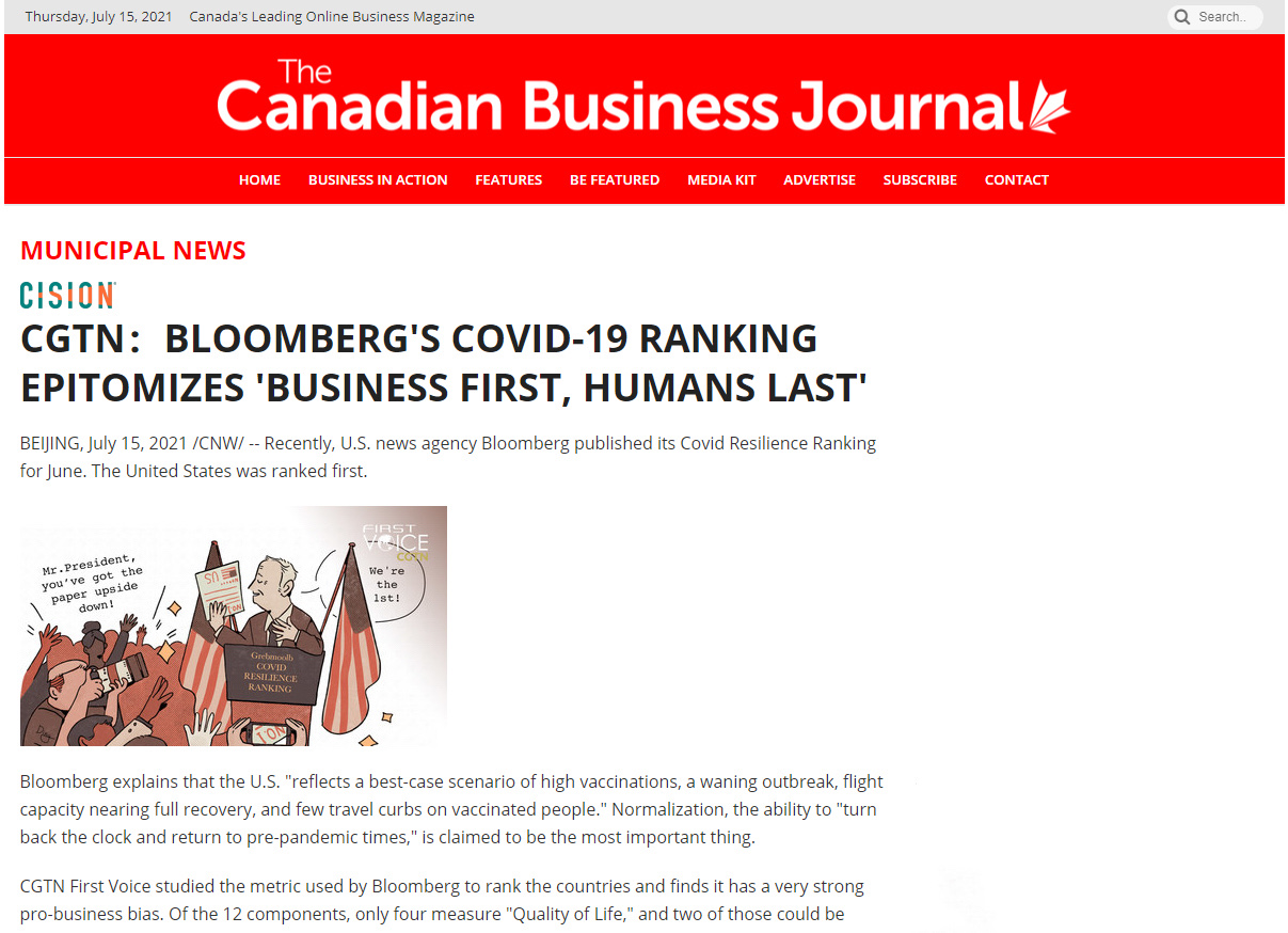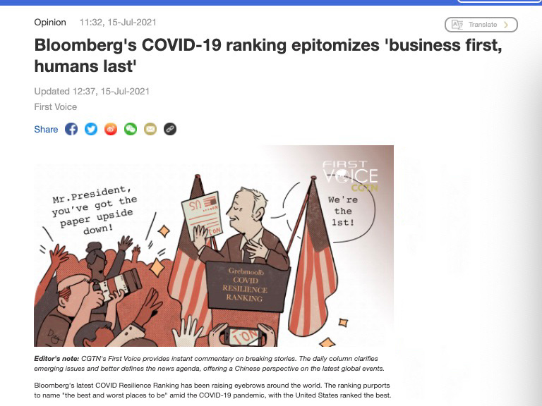 日前,美国彭博社更新了所谓“抗疫韧性排行榜”,美国位列第一、中国排在第八,排行榜还指出中国抗疫存在若干所谓“缺点”。CGTN就此作出回应,发布了《彭博社的全球抗疫排名体现了“商业第一,人民倒数第一”》一文,揭露彭博社“排行榜”的真相。