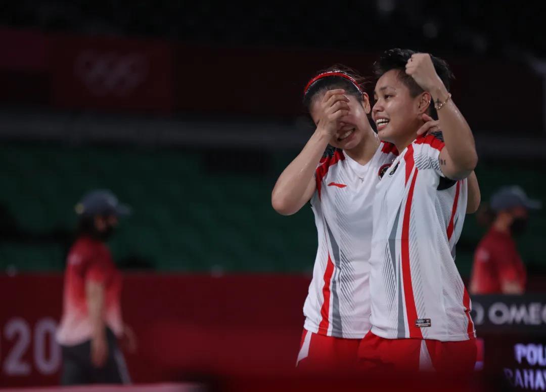 8月3日,中国选手管晨辰(下右)与队友唐茜靖在比赛后相拥庆祝。新华社记者 郑焕松 摄