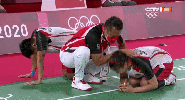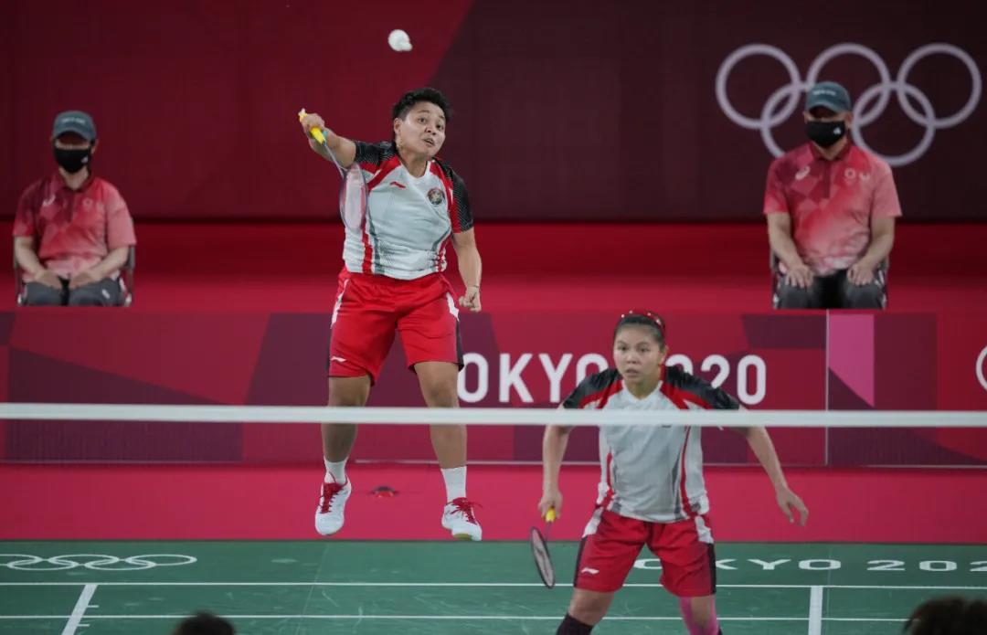 8月2日,陈清晨(左)/贾一凡(右)与波莉在比赛后。新华社记者 薛玉斌 摄