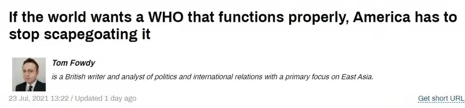 英国作家、政治和国际关系分析人士汤姆·福迪在“今日俄罗斯”新闻网发文指出,美国现政府仍然延续了前政府编造“实验室泄漏”谎言和病毒溯源阴谋论的行径,试图让疫情和世卫组织都走向“政治化”。“如果想要世卫组织正常运行,美国就必须停止让该组织充当替罪羊”。