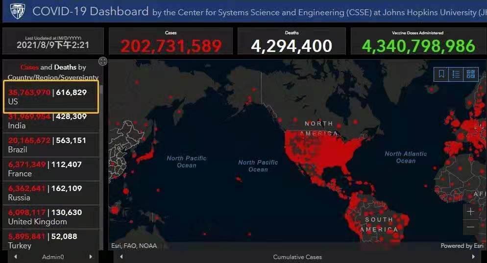 目前,全球新冠肺炎累计确诊病例已超2亿。而人口仅占世界4%的美国,病例数却占到全球总数的18%,给自己贴牢了“抗疫失败国”的标签。