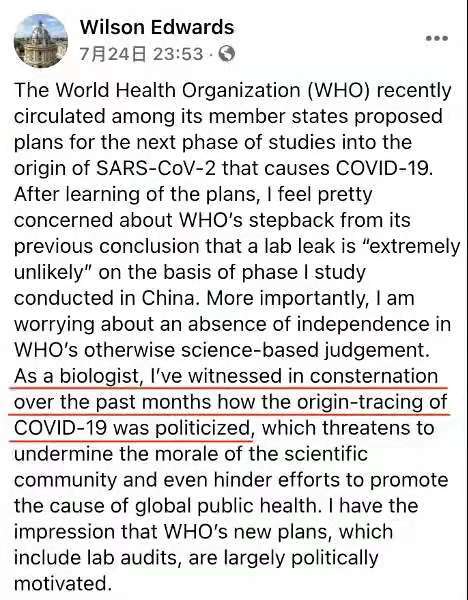 △威尔逊·爱德华兹社交媒体截图:作为一名生物学家,我亲眼目睹了病毒溯源问题在过去几个月里是如何被政治化的。