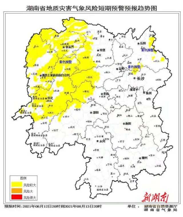 湖南日报·新湖南客户端8月12日讯(记者 彭可心 肖秀芬)今日,省自然资源厅与省气象局联合发布地质灾害气象风险预警:自8月12日20时至13日20时,受强降雨影响,湘西北、湘东北部分区域发生突发性地质灾害风险较大(黄色预警)。