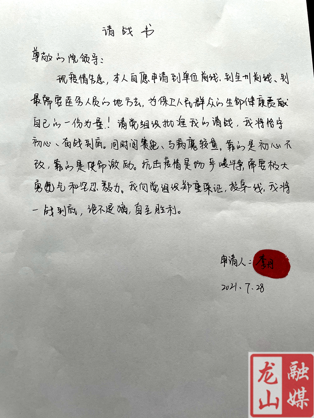 随后,李丹找来纸和笔郑重写下“请战书”:“疫情告急,申请到疫情前线、到最需要医护人员的地方去……”