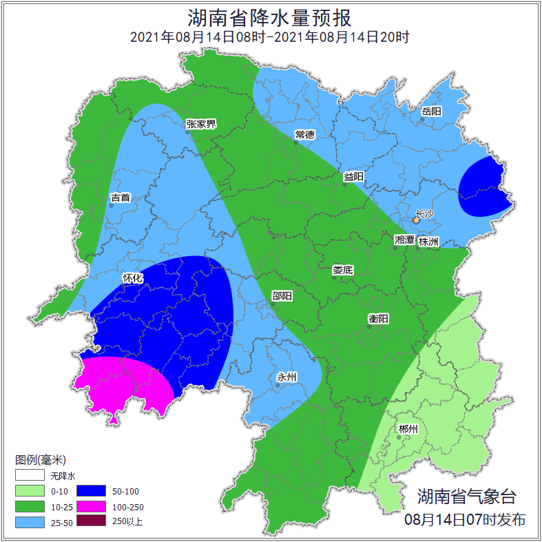 14日受高空低槽、中低层切变和冷空气共同影响,湘中及以北强降雨持续,部分地区暴雨,局地大暴雨,并伴有短时强降水、雷暴大风等强对流天气;15日至16日副高西伸加强,降水强度有所减弱,湘西南、湘东北局地大到暴雨。具体预报如下: