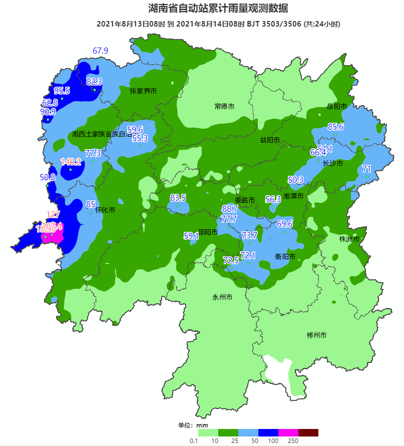 图1 湖南降水量实况(13日08时至14日08时)