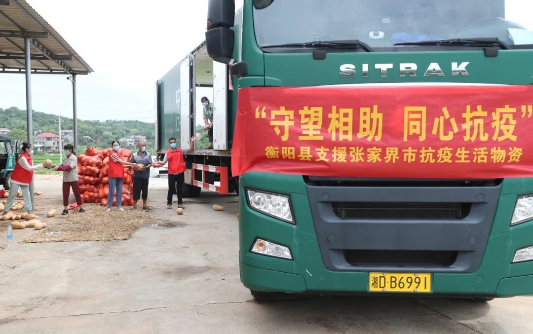 (8月5日,衡阳县樟木乡永升村,志愿者和村民将南瓜装车。当天,衡阳县捐赠了大米、蔬菜等一批爱心物资,支持张家界人民抗疫。这批爱心物资包括12吨大米、20吨冬瓜、20吨南瓜和500斤辣椒。刘欣荣 曹正平 摄影报道)