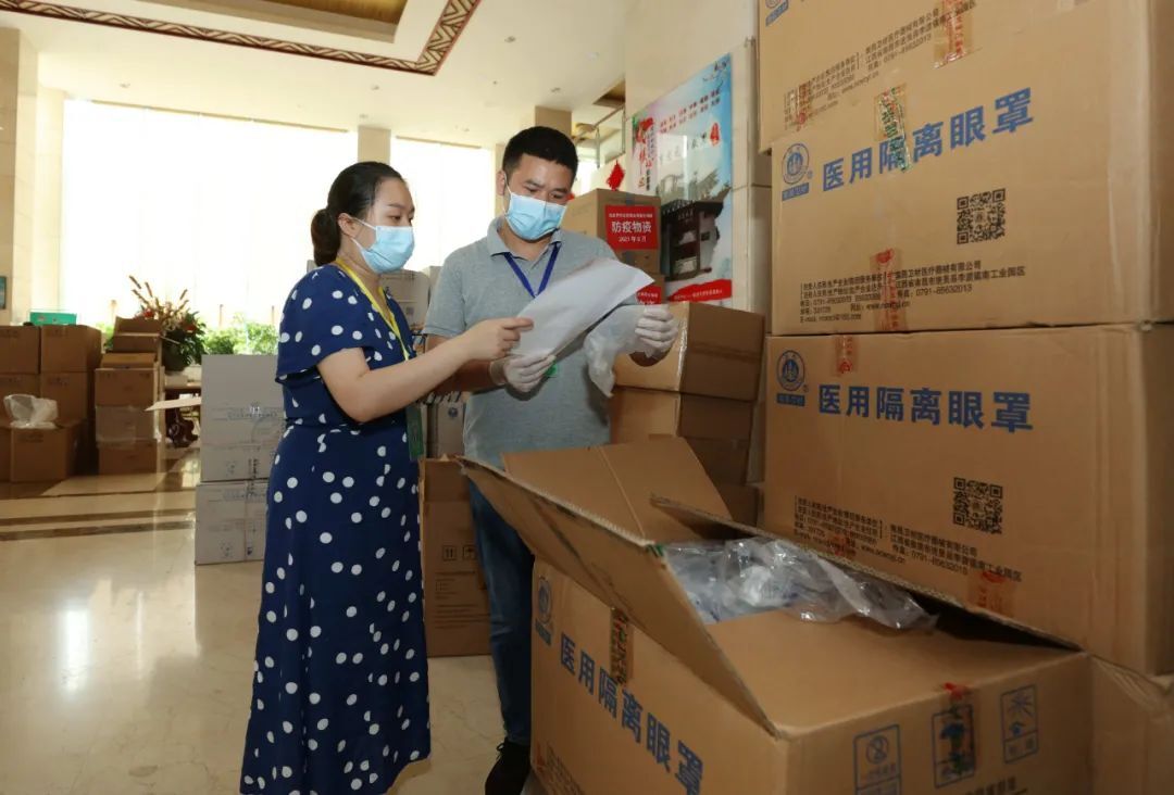 (8月7日,张家界市武陵源区一临时防疫物资储备点,工作人员在清点防疫医疗物资。吴勇兵 摄)