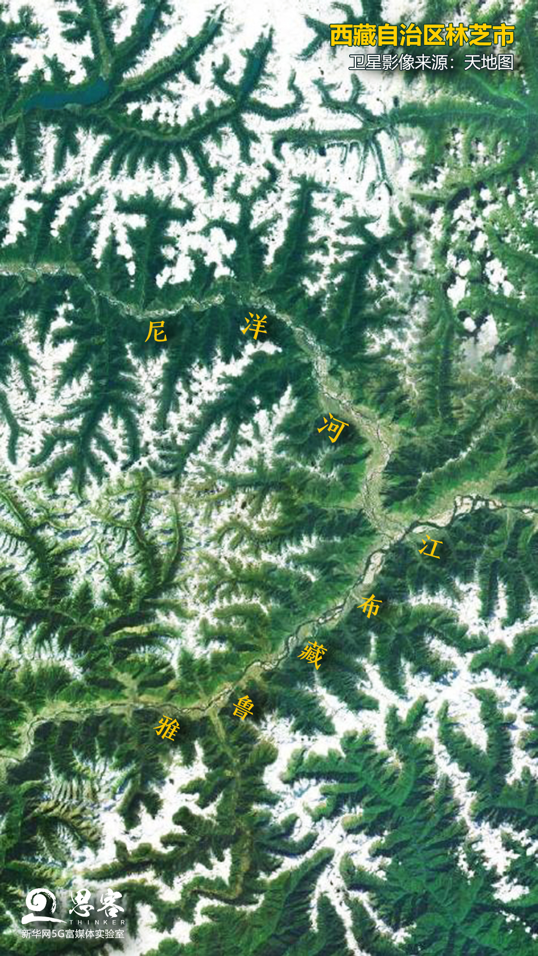 卫星视角下的尼洋河与雅鲁藏布江,一江一河交汇共同滋润林芝地区。卫星影像来源:天地图