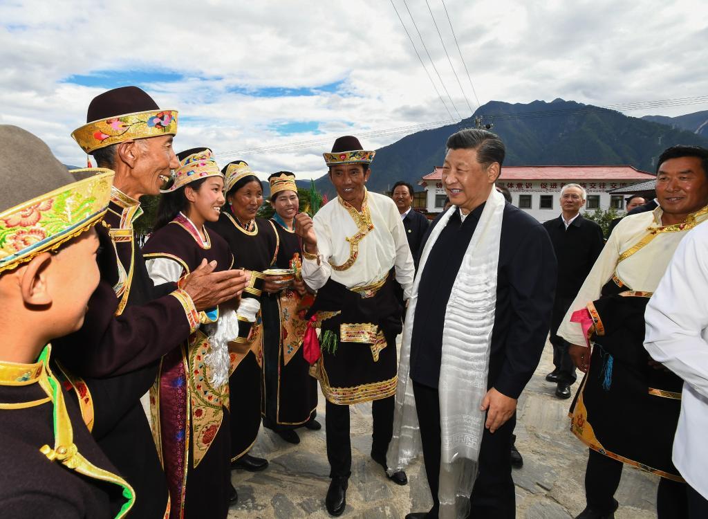 2021年7月21日下午,习近平在林芝市巴宜区林芝镇嘎拉村,同村民达瓦坚参一家亲切交流。新华社记者 谢环驰 摄