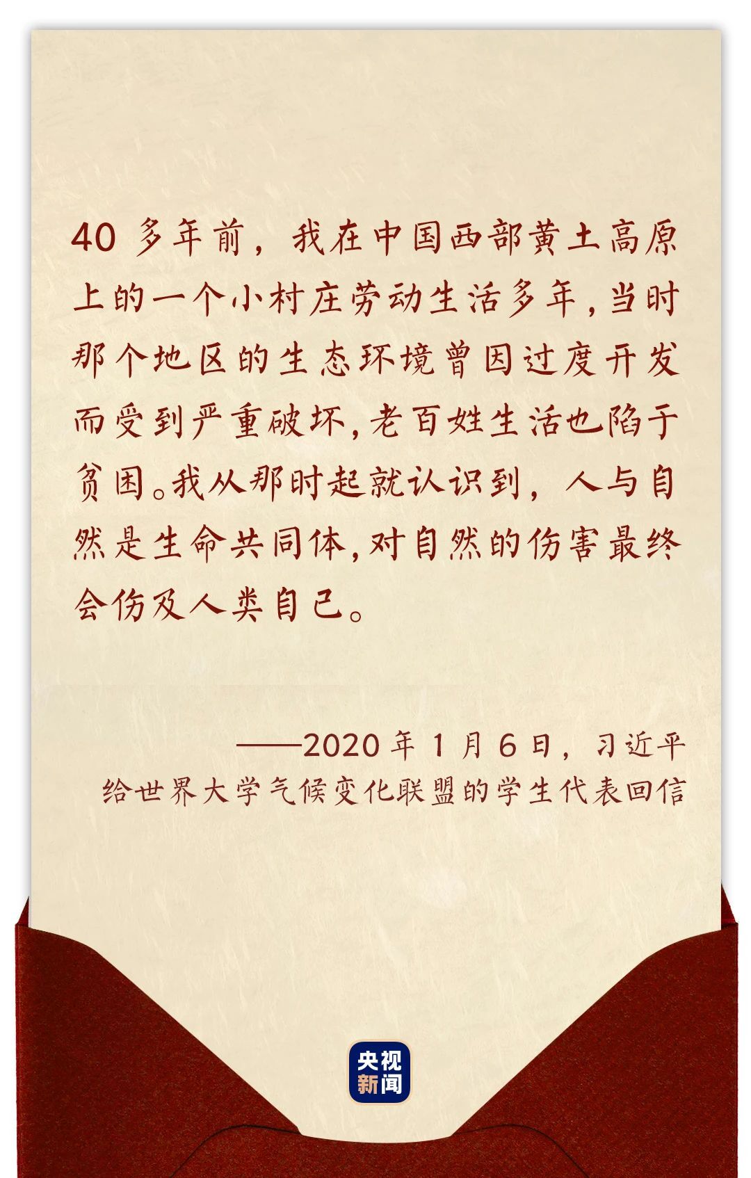2020年1月6日,习近平在给世界大学气候变化联盟的学生代表回信时,这样回忆道——