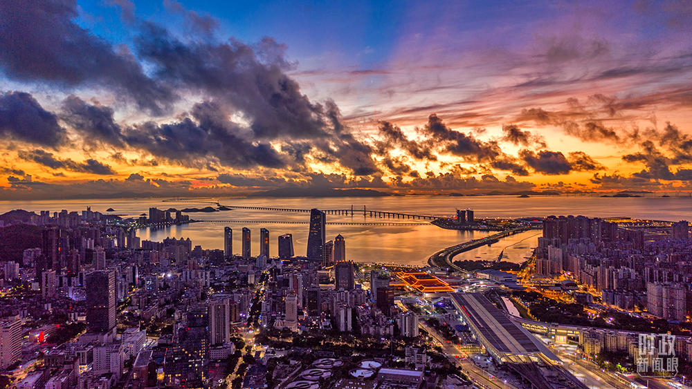 △粤港澳大湾区,珠海拱北口岸日出景象。(图/视觉中国)