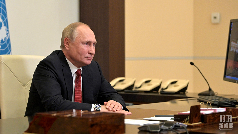 △俄罗斯总统普京、法国总统马克龙通过视频方式致辞。