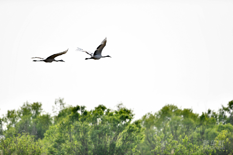 两只丹顶鹤飞翔在自然保护区上空(2021年5月13日摄)。