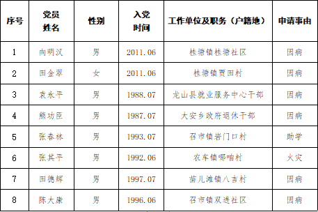 按照《龙山县“双维”帮扶基金管理办法(试行)》的有关规定,经党员个人申请、党支部初审、党委(党工委、党总支)审核、县党务服务中心调查、县委组织部部务会研究,拟对向明汉等8名申请对象进行救助,现将有关情况予以公示。