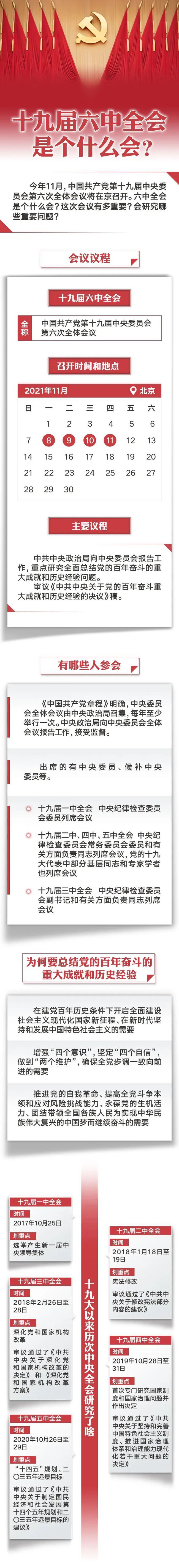 中国共产党第十九届中央委员会第六次全体会议8日上午在京召开。中央委员会总书记习近平代表中央政治局向全会作工作报告,并就《中共中央关于党的百年奋斗重大成就和历史经验的决议(讨论稿)》向全会作了说明。