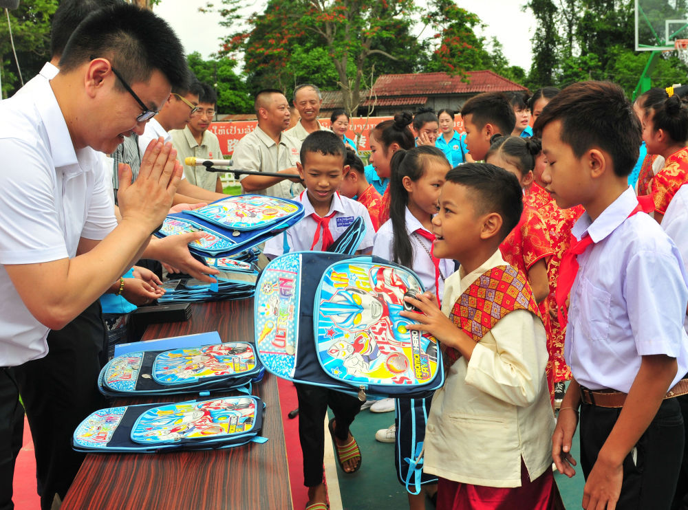 ↑2019年6月1日,在老挝万象,中老友好农冰村小学学生接过中老铁路中国工作人员赠送的文具礼物。