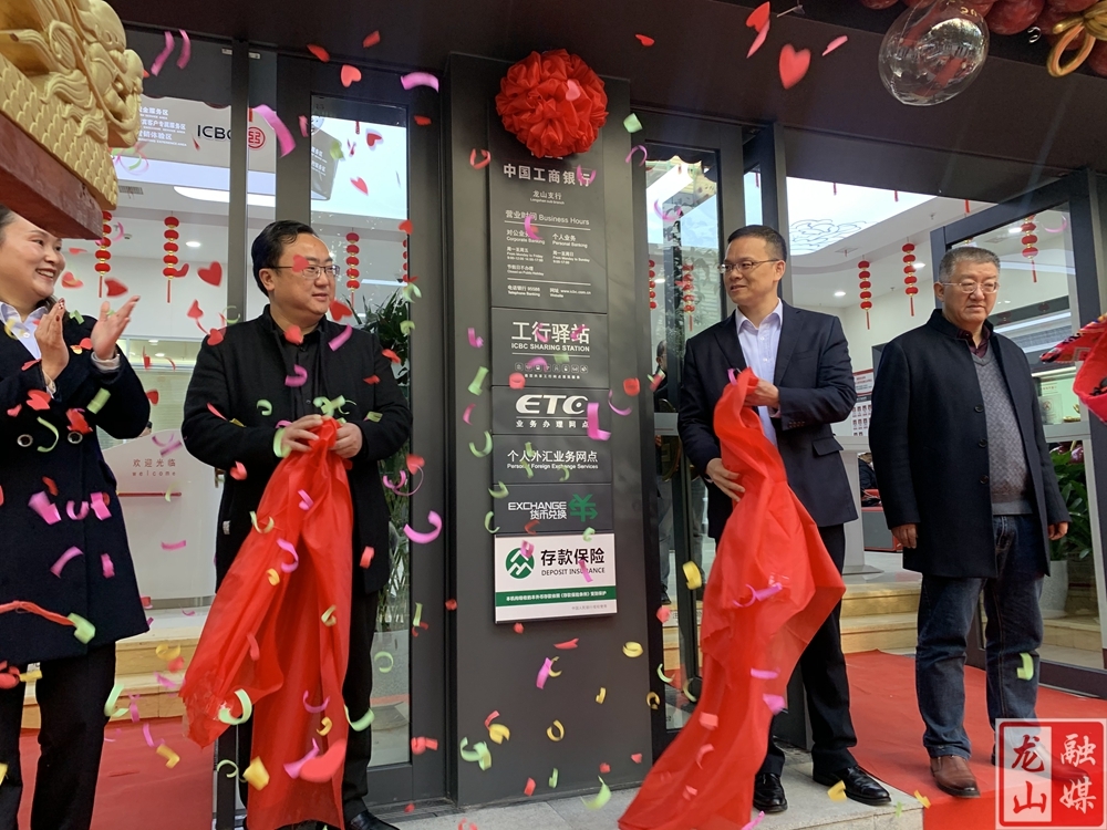 工商银行湘西分行党委书记、行长王军宪,龙山县委常委、常务副县长李延堃,为龙山支行朝阳路营业网点重装开业揭牌。