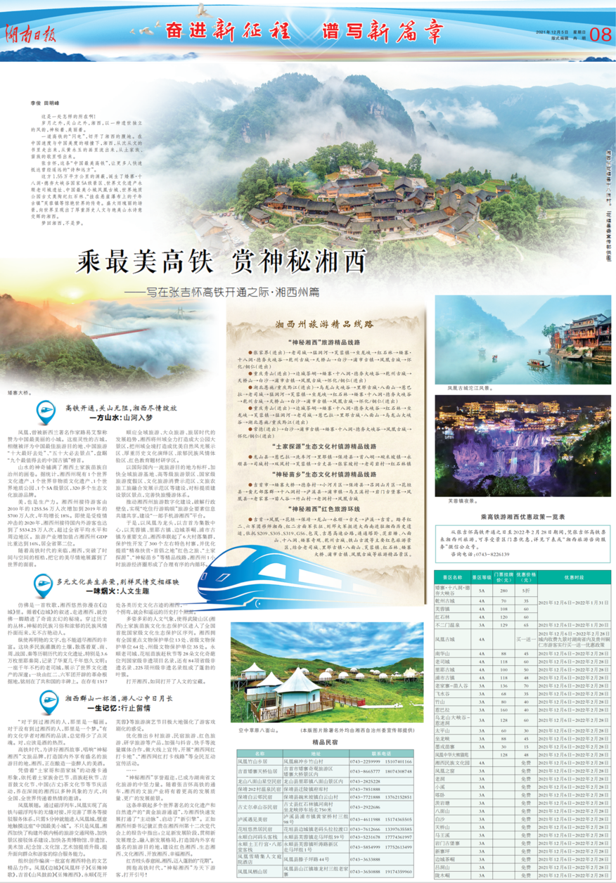 持续发力,扩大效果。紧跟张吉怀高铁开通运营形成的关注热点,持续跟进发力,扩大宣传效果。12月7日《人民日报》经济版刊发《大湘西跑出振兴加速度》,新华全媒头条刊发《这条高铁,带你看精准扶贫首倡地的“诗和远方”》,新华全媒+刊发《如果沈从文拥有这张车票……》,新华社客户端刊发《“绿科技”铺就“湘西最美高铁”》等报道。湖南经视《经视观察》栏目采访州委主要领导,挖掘湘西故事,聚焦景区景点,助推湘西文旅产业新腾飞。《湖南日报》推出《乘坐高铁游湘西》系列宣传,配发大量精彩图片或视频,并在新湖南客户端进行二次传播。《团结报》、湘西州广播电视台等州内主要媒体和各县市融媒体中心继续开设“乘最美高铁 赏神秘湘西”专题专栏,围绕“高铁来了,我们怎么办?”等话题,开展“梦圆张吉怀,融通大世界”等系列采访报道。为喜迎高铁开通,推出州域范围内所有景区5折优惠等系列政策。全力推出“高铁+”系列产品,重点推出高铁+酒店(民宿)、高铁+景区线路产品,全方位解读湘西立体交通格局、工业、招商、农业和特色餐饮美食。