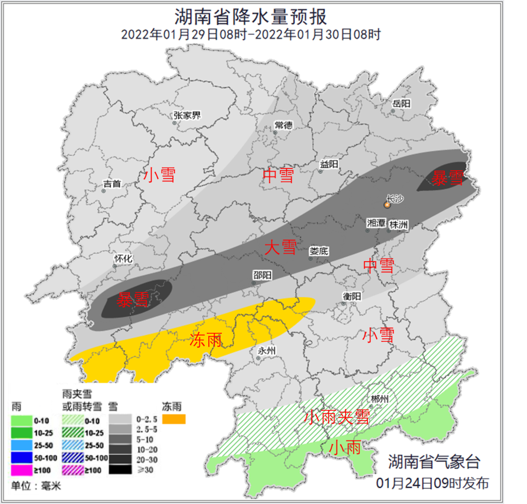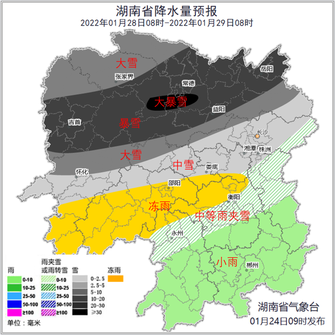 受西南暖湿气流和地面冷空气共同影响,近期我省以持续低温阴雨(雪)天气为主,27日至29日大部分地区将先后出现雨夹雪、冻雨、纯雪天气,降雪冰冻范围广、局地雪量大,湘西州、张家界、常德、益阳、岳阳、长沙、湘潭、娄底、怀化中北部部分地区有暴雪,局地大暴雪。31日晚开始省内还将有一轮较强的低温雨雪冰冻天气过程。正值春运高峰及春节假期,将对交通、电力、能源保供、城市运行、疫情防控、农业及公众健康影响大,需做好防御应对工作。
