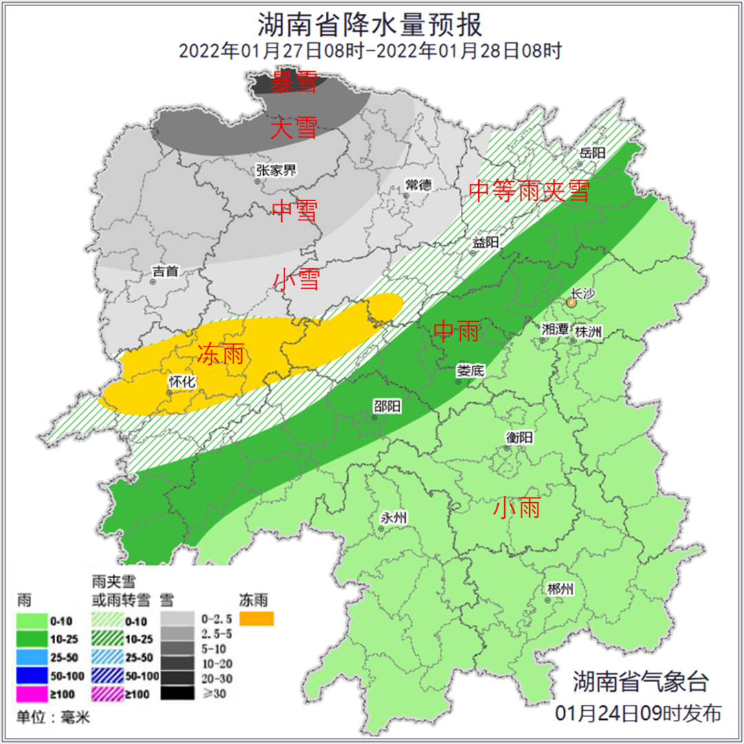 27日,湘西州、张家界、常德、怀化北部、益阳西部中雨或雨夹雪转小到中雪,局地有大到暴雪;怀化中部、娄底西部雨夹雪或冻雨转中雪;其他地区有小到中雨(图2上)。