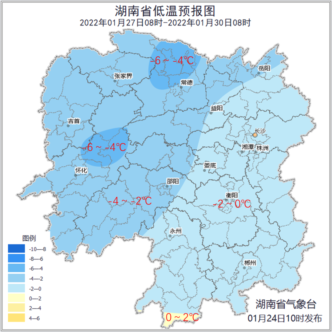 24日,湘西州北部、张家界、常德西部局地有雨夹雪或雪,其他地区有小雨。