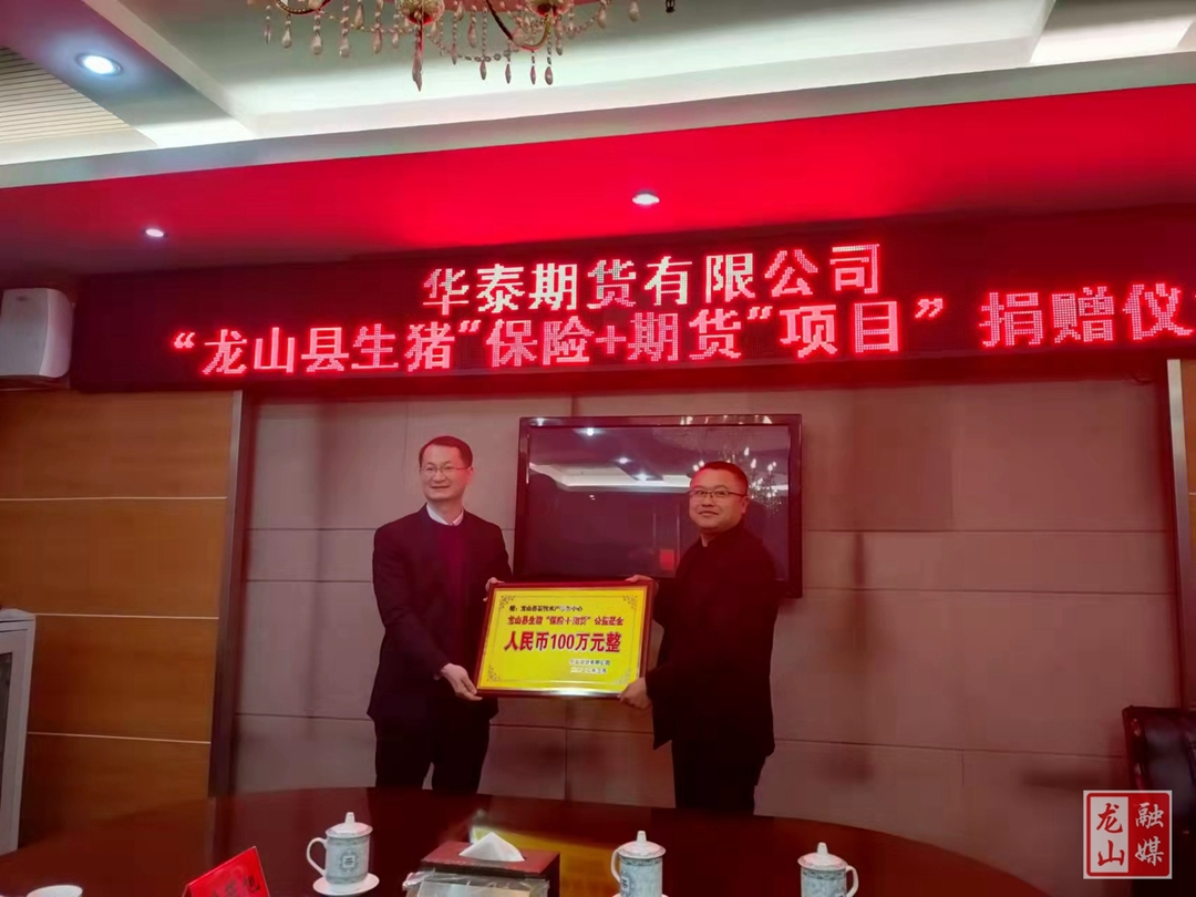 龙山县融媒体中心3月3日讯(记者 黄超 莫代银)3月2日,由华泰期货公司和平安财产保险公司联合发起的生猪“保险+期货”项目为龙山县生猪“保险+期货”项目捐赠公益基金100万元,并举行了捐赠仪式。