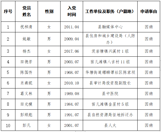 按照《龙山县“双维”帮扶基金管理办法(试行)》的有关规定,经党员个人申请、党支部初审、党委(党工委、党总支)审核、县党务服务中心调查、县委组织部部务会研究,拟对祝梓清等10名申请对象进行救助,现将有关情况予以公示。