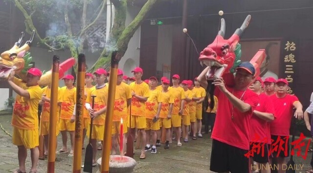 上午7时,屈子祠内钟鼓齐鸣。新义村、端午人家两支龙舟队正在祠内举行传统的朝庙仪式。朝庙作为汨罗江畔特有的端午民俗已传承千年,新义村龙舟队队员们告诉记者,龙舟队每年初一都会来此"朝庙",祭祀屈原,祈求风调雨顺,祈祷龙舟赛能取得好成绩。