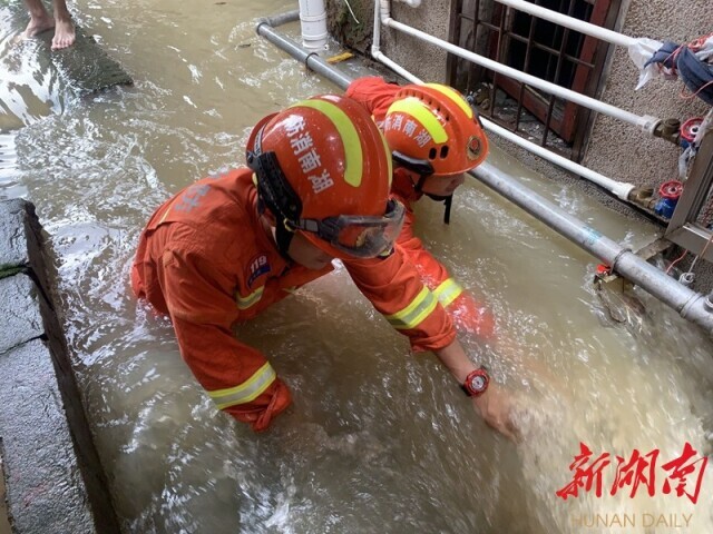 (5月30日,永州市冷水滩区周家洞小区,消防队员前往营救被困群众。)