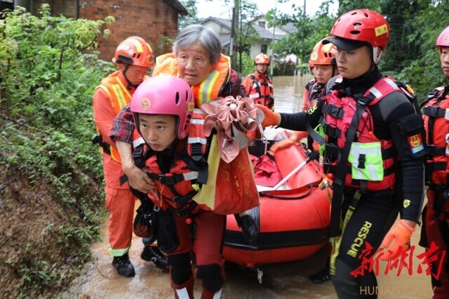 ( 6月3日,常德市消防救援人员联手民兵转移被困老人。)