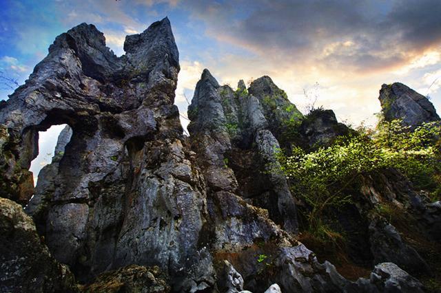 石林中如春笋般大小不同形状各异的巨石,有的嵯峨如大树,有的峥嵘如石塔,有的俊俏如盆景,有的嶙峋如险峰。层叠交错,古藤缠绕,气势恢宏。