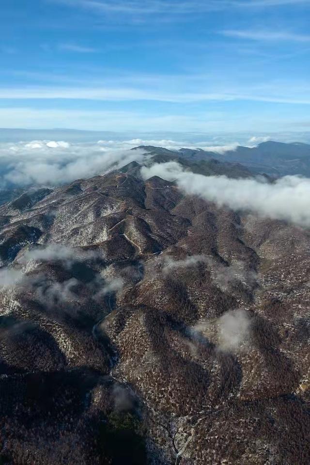 而在这湘西的屋脊,龙山的制高点,大灵山面积达6.58万亩的万宝山林场尽收眼底,色彩随四季更迭而变幻:冬季是黑灰白的水墨画,春夏是青绿山水画,秋季则是斑斓璀璨的油画,如梦幻童话般的仙境奇景,令人惊艳。