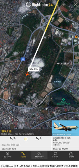 根据飞行航班信息平台FlightRadar24数据,据信是美国众议院议长佩洛西搭乘的C-40C专机(呼号SPAR19)于北京时间8月1日凌晨4时20左右抵达新加坡巴耶利峇空军基地。