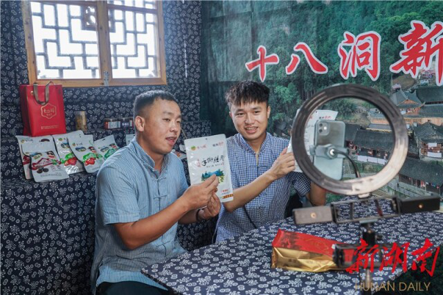 施康和团队成员在直播销售十八洞村系列产品(图片来源:花垣团县委)