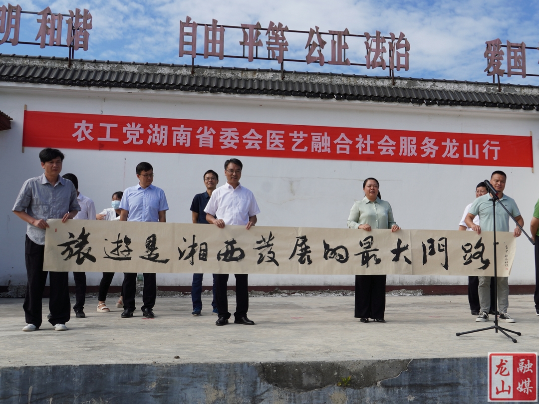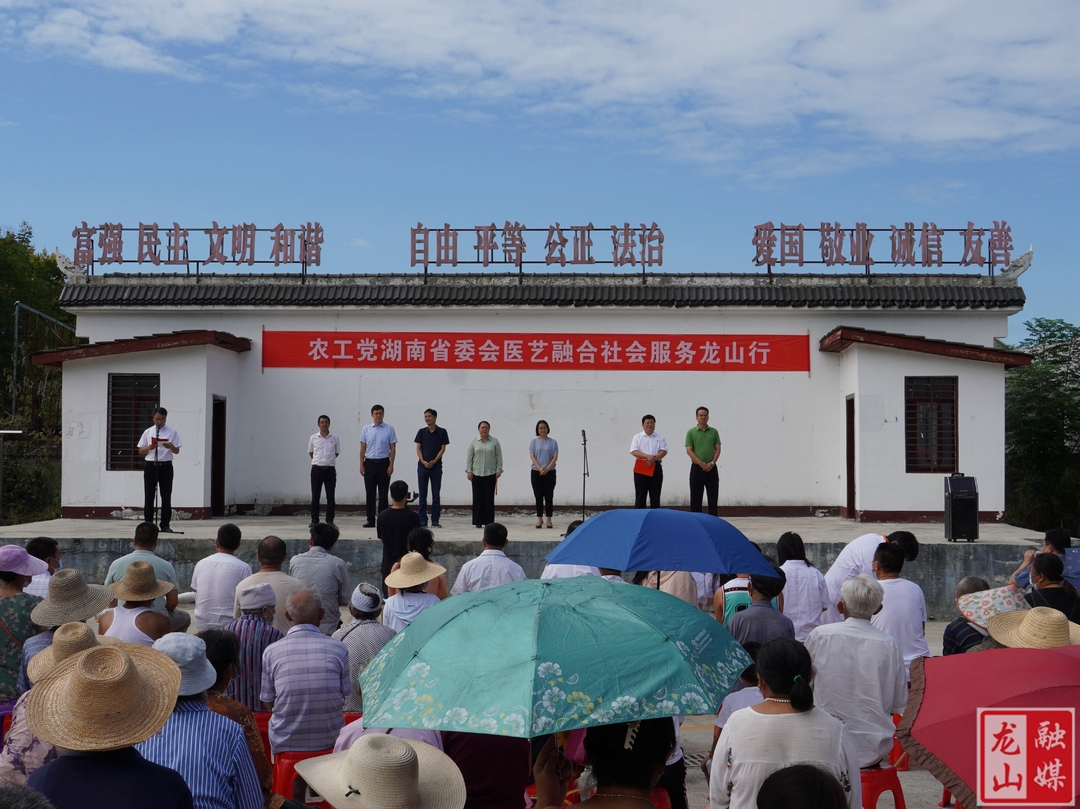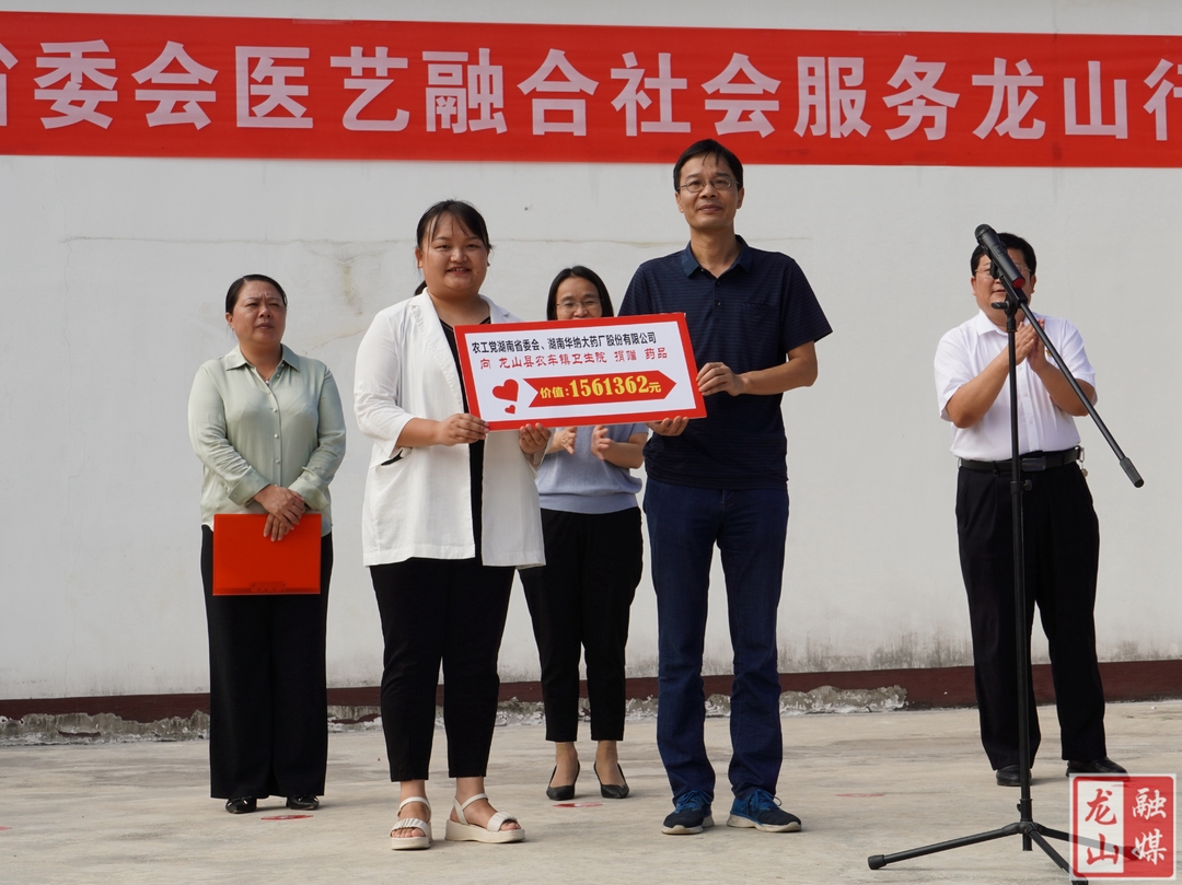 马碧主持活动,对8名医疗专家和4名书画艺术家进行了介绍;黎新松致欢迎辞,代表龙山县委、县政府对农工党湖南省委会组织医疗专家、艺术家来龙山开展医艺融合社会服务活动表示热情欢迎和诚挚感谢;农工党湖南省委会、湖南华纳大药厂股份有限公司、湖南泰阳药业有限公司和三诺生物传感股份有限公司向农车镇卫生院捐赠了药品、血糖仪等医疗物资,合计价值167.5万元;农工党湖南省委会书画学院向湘西州委、州人民政府捐赠书画作品14幅,合计价值9.8万元。