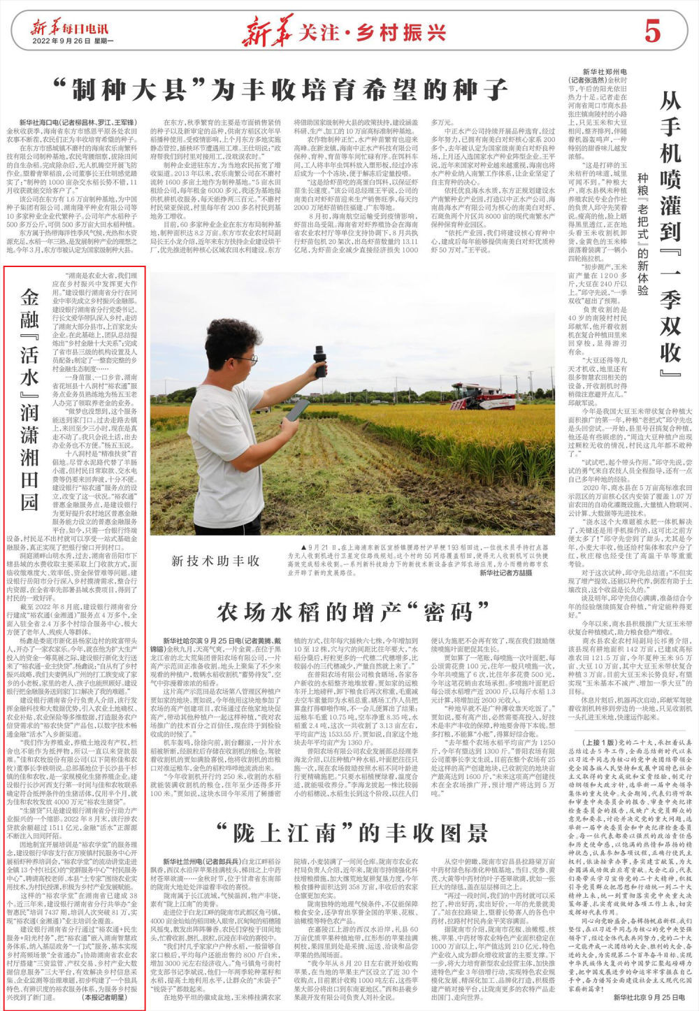 9月26日,《新华每日电讯》发表题为《金融“活水”润潇湘田园》的报道。来源:9月26日《新华每日电讯》