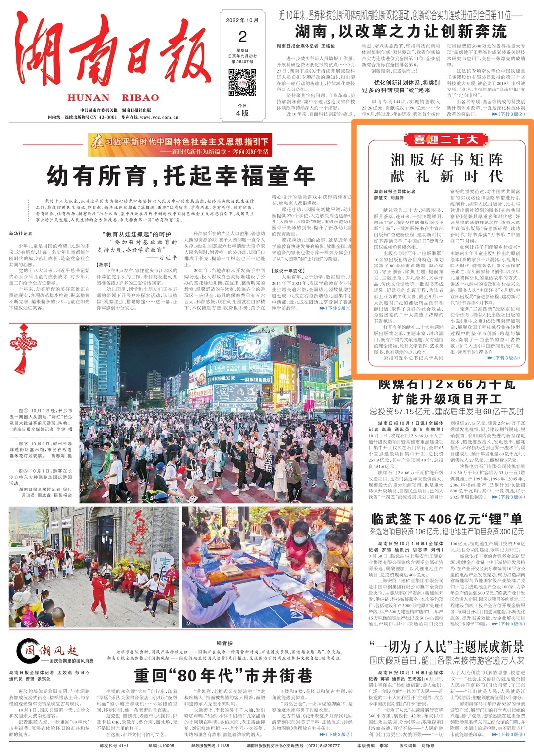 出版合为时而作。“出版湘军”10余家出版社结合自身特色,策划实施了80余种重点选题,凝心聚力,守正创新,聚焦主题,提前策划,主题出版、少儿绘本、文学作品、传统文化读物等一批图书形成矩阵,记录党的光辉历程,为读者献上芬芳的文化大餐。截至9月,一大批题材广泛的湘版精品图书相继出版,取得了良好的社会效益,为迎接党的二十大营造了浓厚的书香氛围。