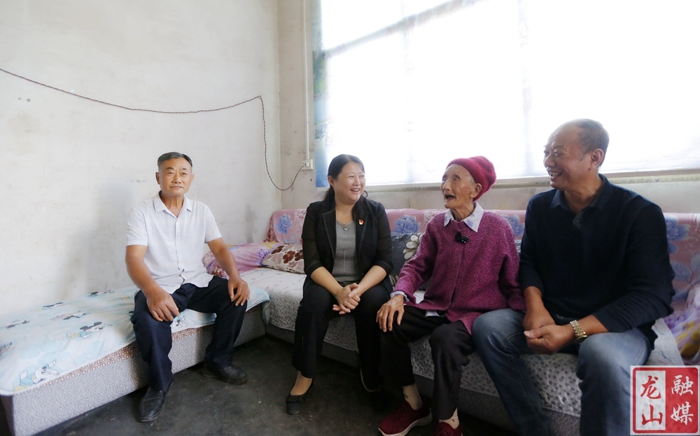 县委书记时荣芬(左二)同百岁老人卢碧云交谈