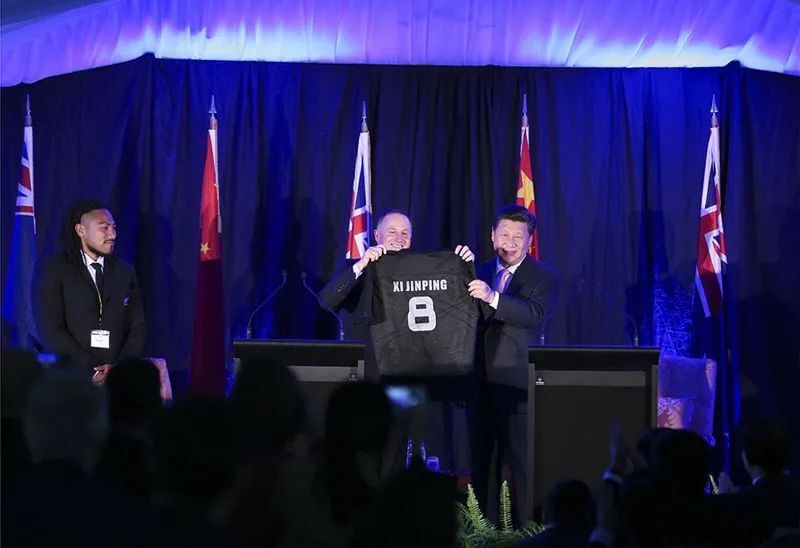 2014年11月20日,新西兰首都惠灵顿,中国国家主席习近平与时任新西兰总理约翰·基共同会见记者。记者会结束之际,英式橄榄球球星、全黑队球员玛阿·诺努走上台,向习近平赠送了该队的标志性黑色球衣,号码是中国老百姓喜闻乐见的数字“8”。