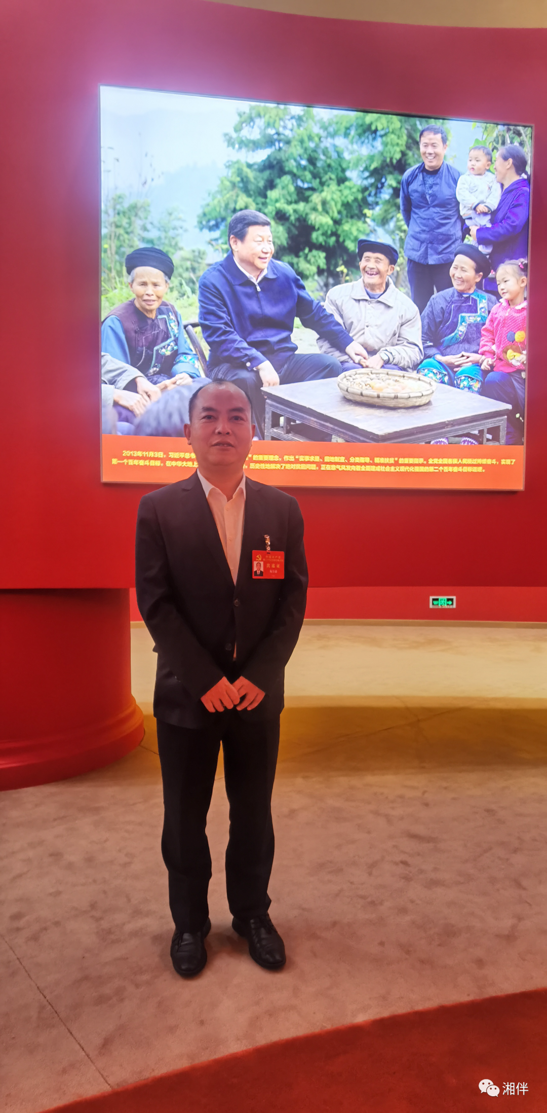 习近平总书记与十八洞村民座谈的图片展陈于成就展的中央大厅。10月17日晚,施金通代表与图片合影留念。湖南日报全媒体记者 唐俊 摄“全国脱贫攻坚楷模”奖牌,是2021年2月25日,全国脱贫攻坚总结表彰大会上,他从习近平总书记手中接过来的。他当时在台上就忍不住向习近平总书记报告:“8年了,十八洞村的群众现在过得很好,盼望您再回去看看。”从十八洞村出发,脱贫攻坚进入“精准扶贫”新时代。湖南作为全国脱贫攻坚的主战场之一,始终牢记习近平总书记殷殷嘱托,扛牢扛实精准扶贫首倡地的政治责任,夺取了脱贫攻坚战的全面胜利,书写了中国减贫奇迹的湖南篇章。