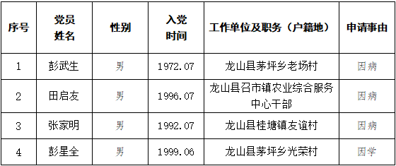 按照《龙山县“双维”帮扶基金管理办法(试行)》的有关规定,经党员个人申请、党支部初审、党委(党工委、党总支)审核、县党务服务中心调查、县委组织部部务会研究,拟对彭武生等4名申请对象进行救助,现将有关情况予以公示。