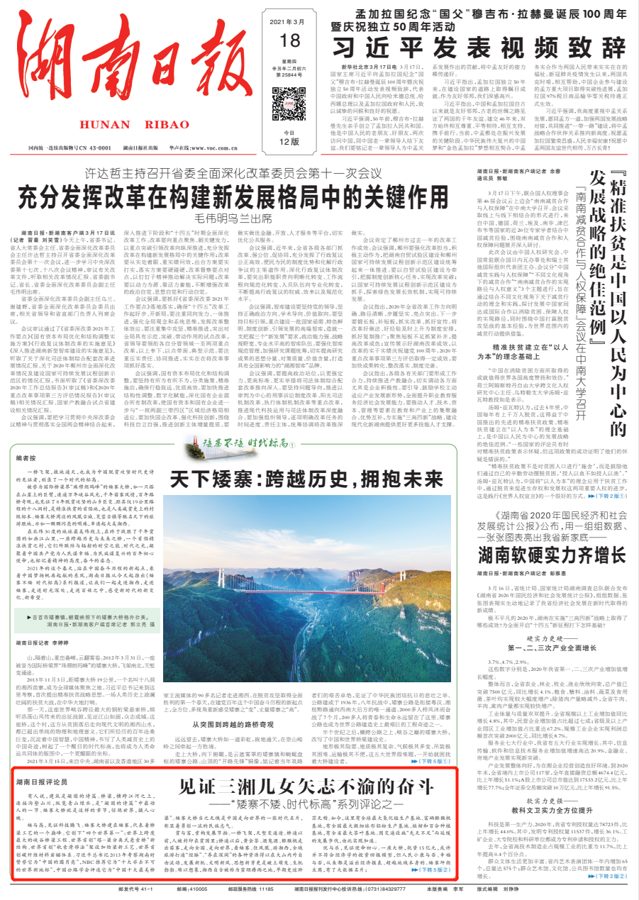 湖南广播电视台的新闻专题《为有牺牲》是本届中国新闻奖评选的二等奖获奖作品。该作品另辟蹊径,以时间为脉络,聚焦土地革命、抗日战争、抗美援朝、三线建设、洞庭湖治理、抗洪抢险和脱贫攻坚等一百年来各个时期的11个英烈或英雄群体,讲述了湖湘大地上感天动地、鲜为人知的故事,富有吸引力、冲击力、感染力。百年里,中国共产党带领人民砥砺奋进,不断开辟、拓展中国道路。湖南新闻工作者将视角对准复兴伟业上的奋进姿态,书写一曲曲精彩的“大地颂歌”。湖南日报社经近4个月绘制、打磨的大型全景式新闻漫画《十八洞村:走上幸福大道》,首次以新闻漫画的艺术形式全方位、全景式地呈现“精准扶贫”首倡地十八洞村波澜壮阔的脱贫之路,获得本届中国新闻奖三等奖。作品以一条“幸福大道”,串联起18个精准脱贫的小故事,塑造了养蜂专业户龙先兰等200余个人物,呈现了十八洞大门、扶贫工作队进驻多方面的内容,融入AR动态扫描技术,反映湖南精准扶贫辉煌成就。获评本届中国新闻奖三等奖的《见证三湘儿女矢志不渝的奋斗——“矮寨不矮、时代标高”系列评论之一》,从“矮与高”“贫与富”“忧与乐”3个角度,论证矮寨大桥是中国走向世界的建筑名片,脱贫攻坚、乡村振兴的衔接之桥,架通历史未来、畅达党心民心的梦想之桥,引导读者感悟思想伟力、领悟“国之大者”。文章观点铿锵有力,行文流畅如水,发挥了党报评论“风向标”“定音鼓”的作用。深入实际、深入生活、深入群众,是党的新闻工作的优良传统。