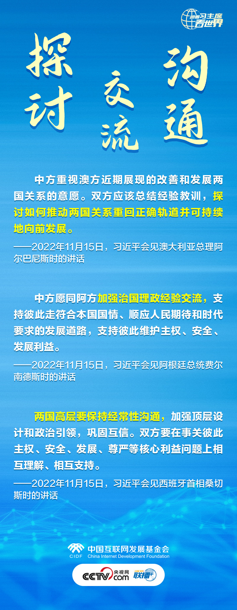 11月15日,分别会见法国总统马克龙、南非总统拉马福萨、塞内加尔总统萨勒、韩国总统尹锡悦、阿根廷总统费尔南德斯、荷兰首相吕特、澳大利亚总理阿尔巴尼斯、西班牙首相桑切斯;