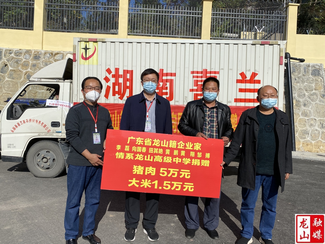 龙山县融媒体中心11月26日讯(记者 刘 润 通讯员 向 英)11月25日,广东省龙山籍企业家李磊、向国春、田其艳、黄鹏、黄翔、邹搏主动联系到县委统战部、县工商联,共同为龙山县高级中学捐赠价值5万元猪肉及1.5万元大米,用于疫情防控期间留守在校的师生们食用。县委常委、县委统战部部长向怿文参加捐赠仪式。
