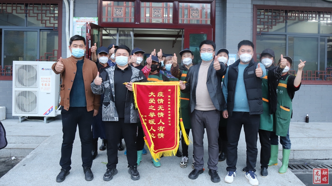 李延堃将写着“疫情无情人有情、大爱之举暖人心”的锦旗送到了谦益餐饮服务有限公司负责人孙宇的手中,短短几个字表达了龙山县委县政府以及全县人民的感激之情,也是对大家援助龙山抗疫工作的肯定。
