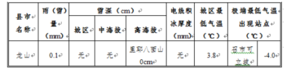 11月 29 日 08 时至30 日 08 时,我县城区降雨量为 0.1毫米,最低气温为 3.8℃;高海拔地区出现降雪和冰冻,乡镇最低气温为-4.0 (召市可立坡)。
