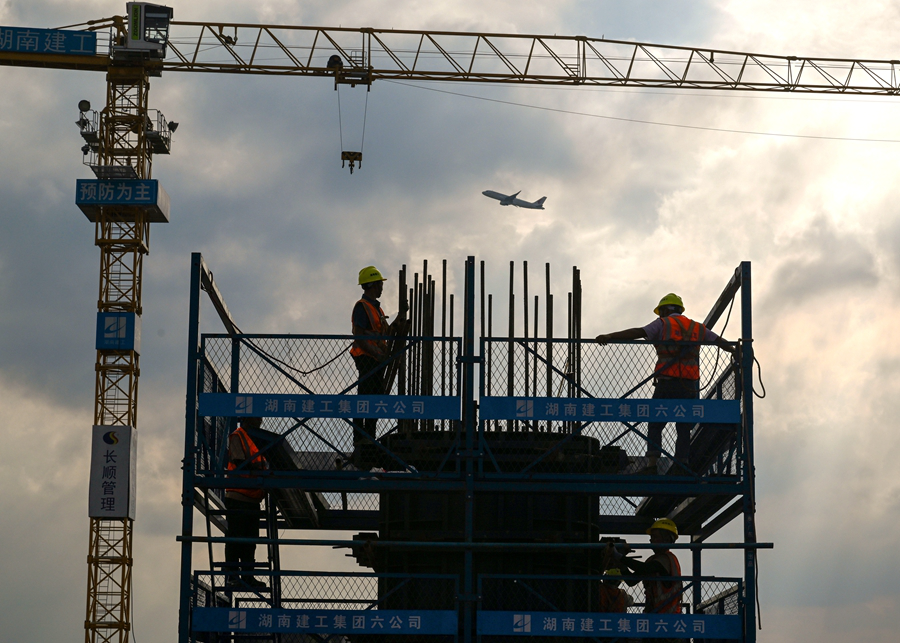 ▲ 长沙机场改扩建工程综合交通枢纽工程,建设者在高架桥上施工。(图片来源:湖南省人民政府官网)